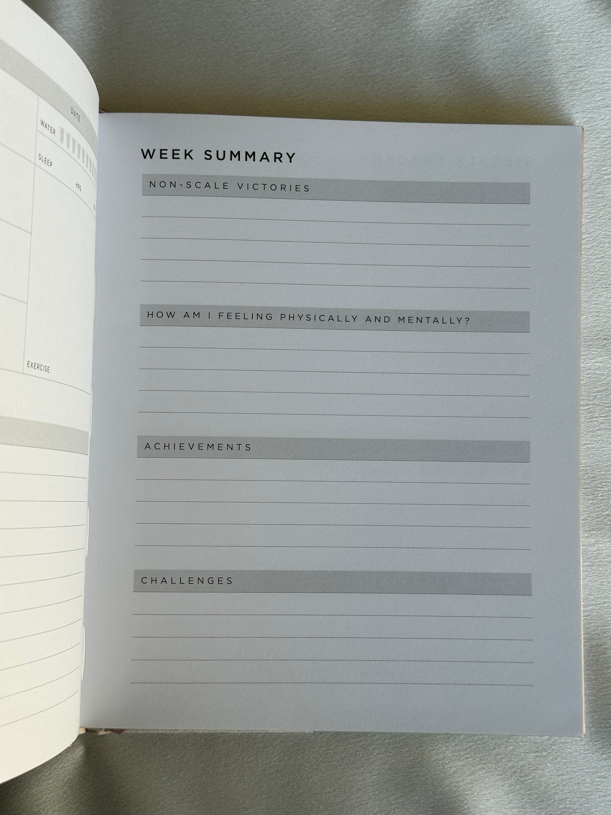 - Weekly Reflection: Dedicated check-ins for your physical goals, including prompts for non-scale victories and how you are feeling mentally and physically.