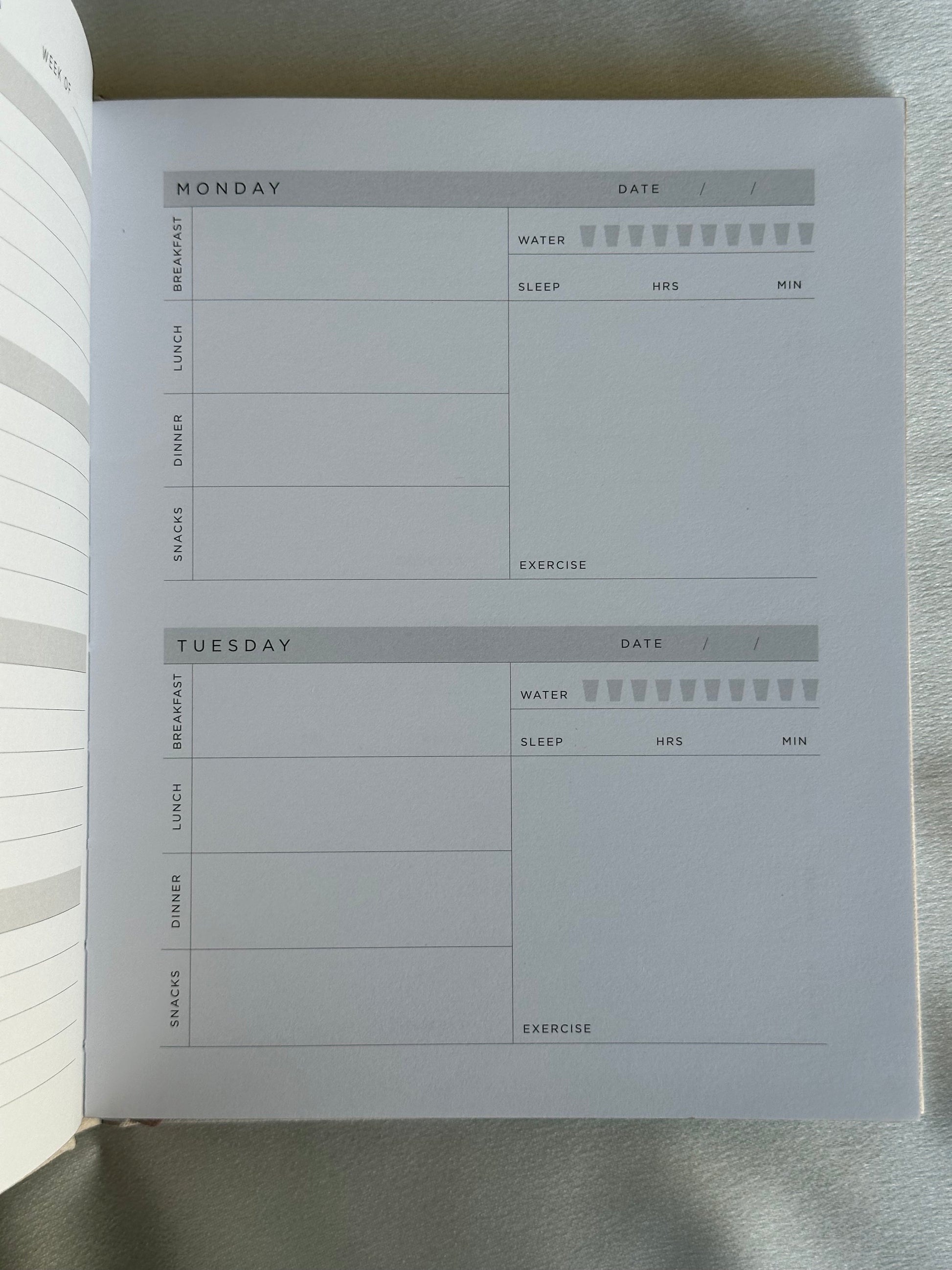 - Daily Logs: Space to track your meals, water intake, sleep, and exercise every day.